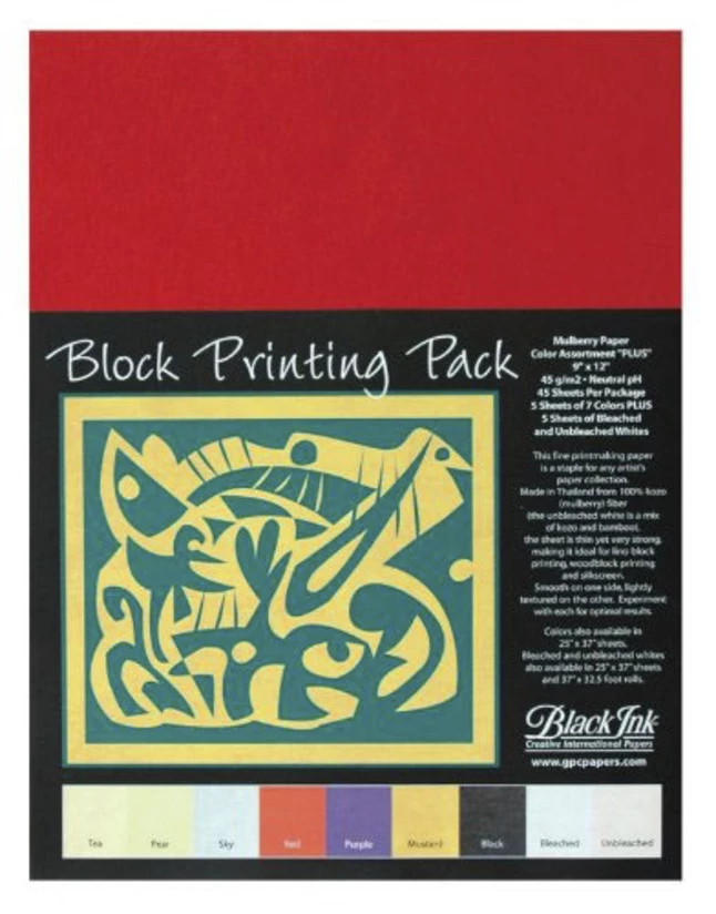 Black Ink Block Printing Paper measuring 9 x 12 inches is smooth on one side and lightly textured on the other. Paper made from 100% mulberry fiber is thin, yet strong is ideal for lino block printing, woodblock printing and silkscreen. Fine printmaking sheets with a neutral pH sold as 4 per pack with 5 sheets of 7 colors that includes tea, pear, sky, red, purple, mustard, black, 5 sheets each of bleached and unbleached white.